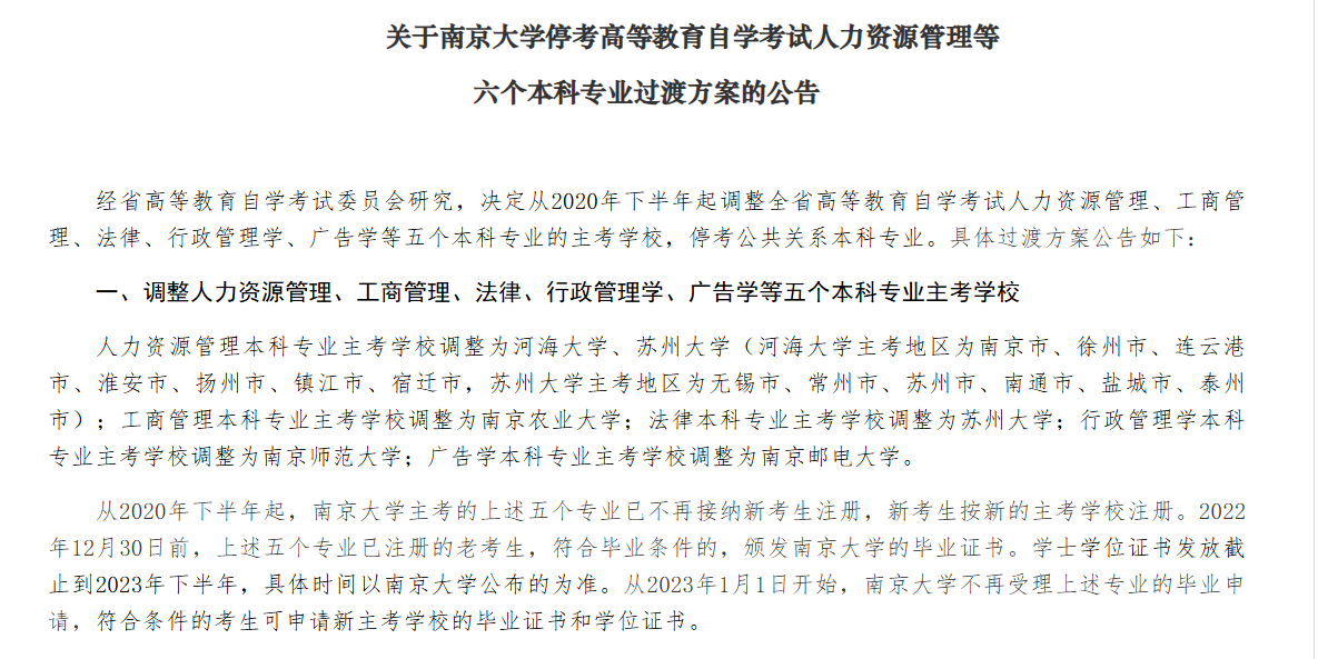 我第一次考的人力资源管理已经熄火了,南京大学整个学校退出自考,导致下属的五个专业直接换了家(有两年多的停考期)。当然也不全是坏处,人力资源管理本科段被两个学校瓜分,学位课还减少了,学位证的难度的确下降了。