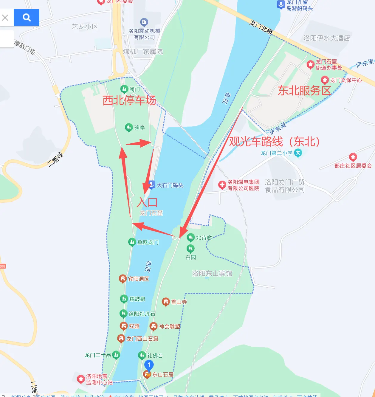 途中会从东往西跨过伊河,这一段路两公里,往返单次10元,景区内部比较大,推荐坐车。